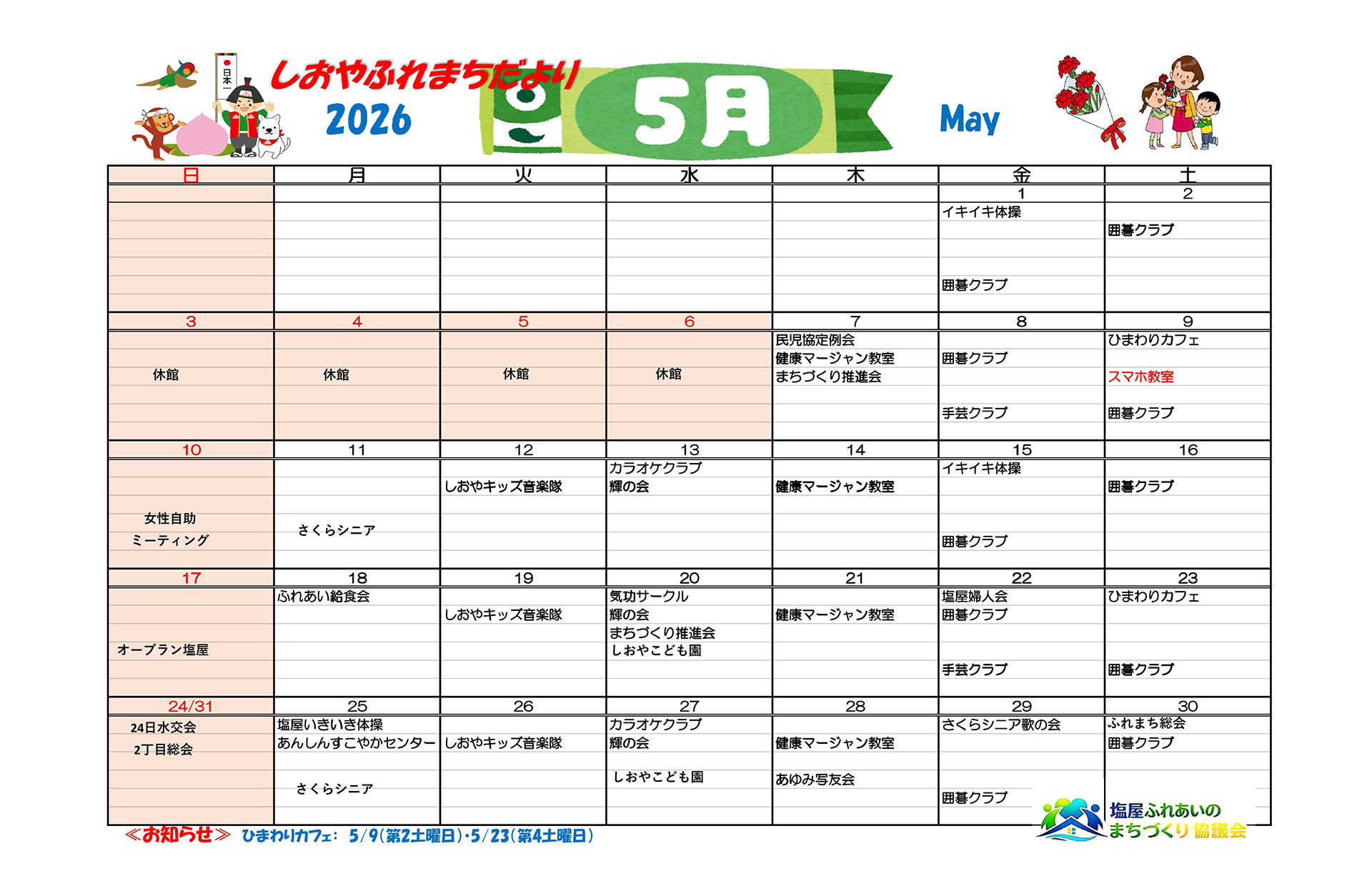 塩屋ふれまち(塩屋ふれあいのまちづくり協議会)は、塩屋地域交流センターを拠点として、塩屋地域の福祉活動および交流活動を企画/実施しています。